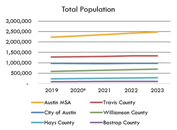 The five-county Austin MSA exceeded 2,450,000 in total population in 2023, having grown by almost 250,000 from 2019 to 2023. Today, Travis County makes up more than half of that total with a resident population of over 1.3 million people.