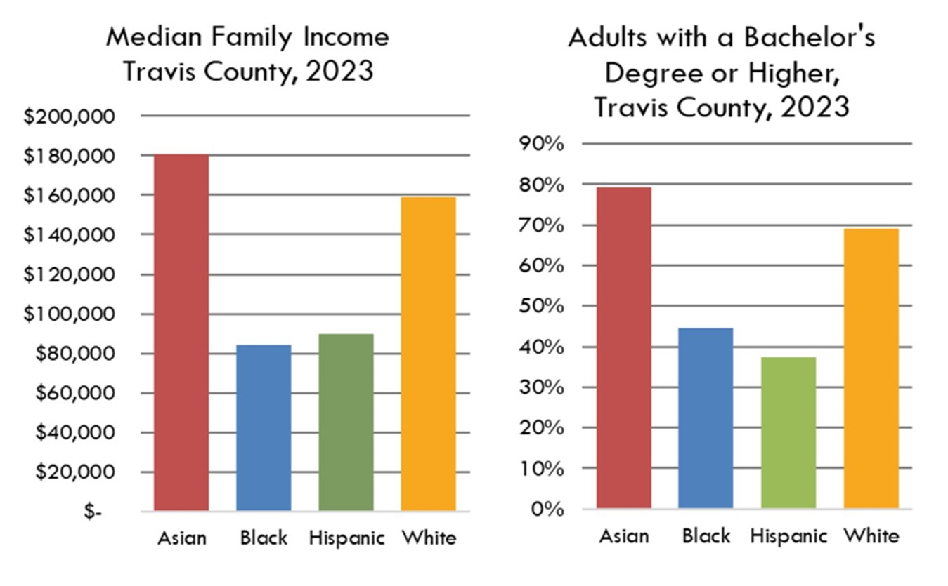 There are stark differences in educational attainment levels and median household income by race and ethnicity. The first graph depicts median family income. The second graph depicts the percent of people in Travis County, over the age of 25, who have a Bachelor’s degree or higher. Approximately 45% of Black adults over the age of 25, and 37% of Hispanic adults over the age of 25, have a Bachelor’s degree. This contributes to lower household incomes for these groups. Increasing educational opportunity and educational success for people of all races and ethnicities is one way we can bridge the economic divide and increase access to opportunity.