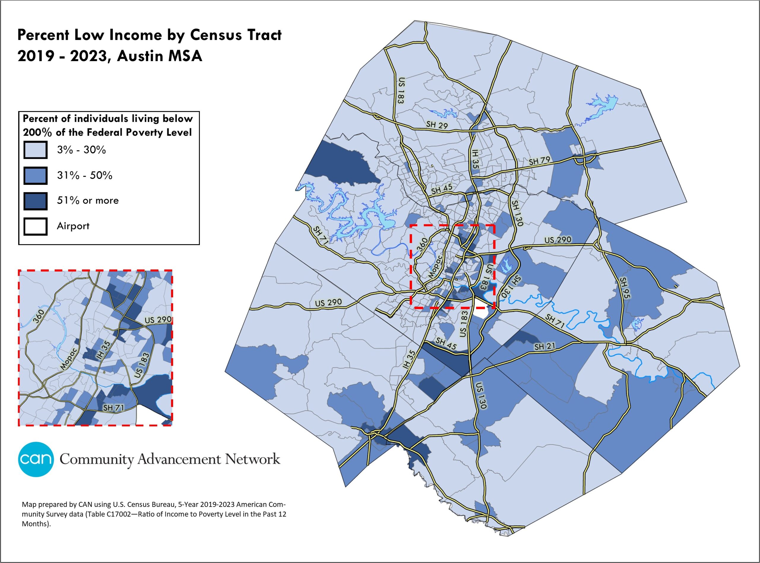 An estimated 21% of all people living in the five-county Austin Metropolitan Statistical Area are low-income. “Low-income” is defined as people who live in a household with total earnings of less than 200% of the federal poverty threshold or less. In 2023, these were $61,800 for a family of four (consisting of 2 adults/2 children) and $49,098 for a family of three (consisting of 1 adult/2 children).