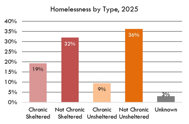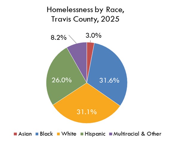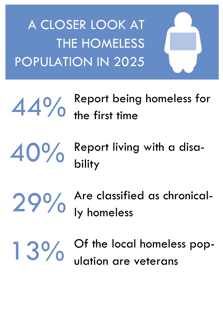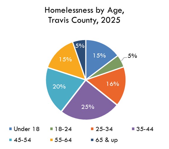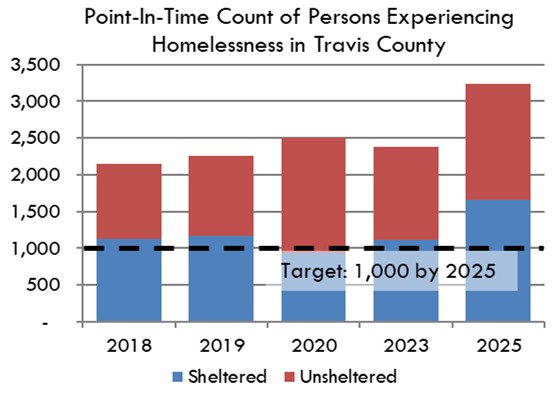 The January 2025 Point-in-Time Count identified 3,238 people who were either staying in an emergency shelter, transitional housing, or who were living on the streets, in cars, or other areas not intended for human habitation. This annual count measures people who are experiencing homelessness on a specific day. The Ending Community Homelessness Coalition (ECHO) also reports that the percentage of those who were unsheltered for the first time increased to 44% in 2025, and that the percentage of those who were unsheltered that said they first experienced homelessness in Austin was 68%.