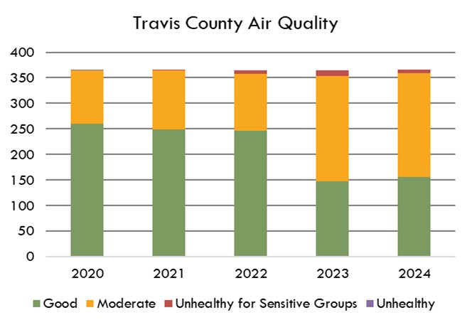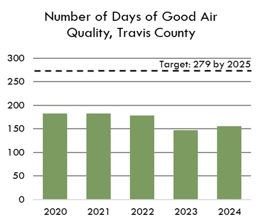 Our region remains near the current ozone standard. As of 2022, our design value for ozone is 64 parts per billion (ppb). The standard is 70 ppb. In 2021, there were 116 days when air pollution levels in the region were considered “moderate” or worse.