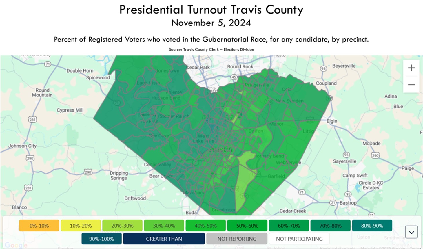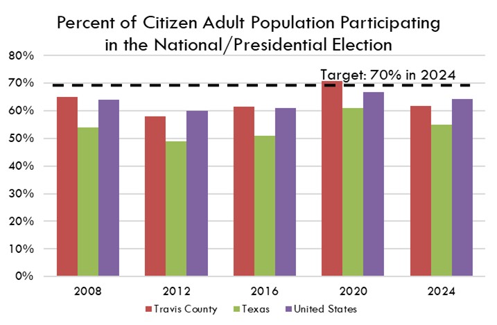 Voter turnout of the citizen voting age population in Travis County was 62% for the 2024 presidential election, the third highest turnout seen in Travis County in this type of election since tracking of this indicator began.